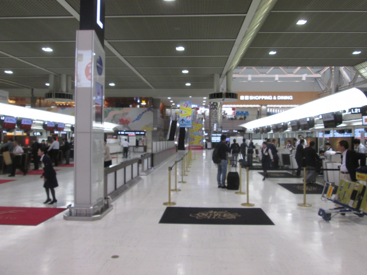成田空港第2ターミナルのJALチェックインカウンターに、グローバルクラブ専用のデスクがあります。黒地のカーペットに金色のJGCロゴが高級感を感じます。そして、自分がお客であることを再認識させてくれる対応をしてくれます。