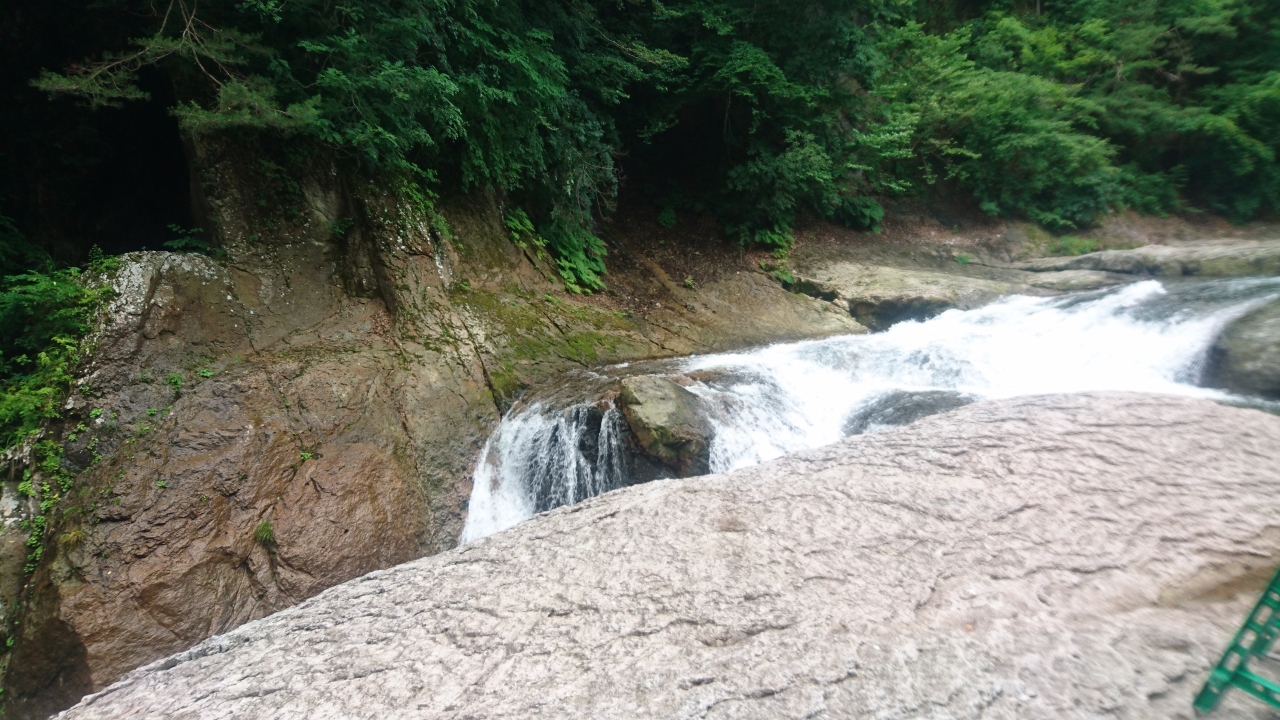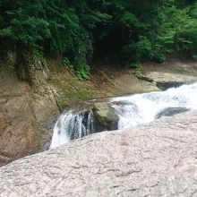 吹割の滝の遊歩道を下流に向かって歩いて行くと頭上に看板が出て来て、もう1つ名前のついている滝がある事を知った。滝の近くの岩の上にはロープが張られていて滝の下の方は見えない。階段を登る途中からの方がよく見えた。