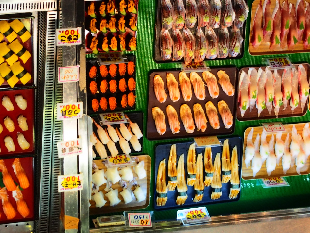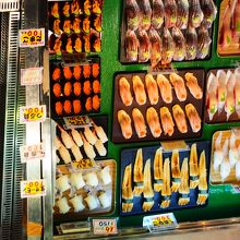 店によって値段も寿司も異なるので目移り必至。閉店前のデパチカ状態でした。