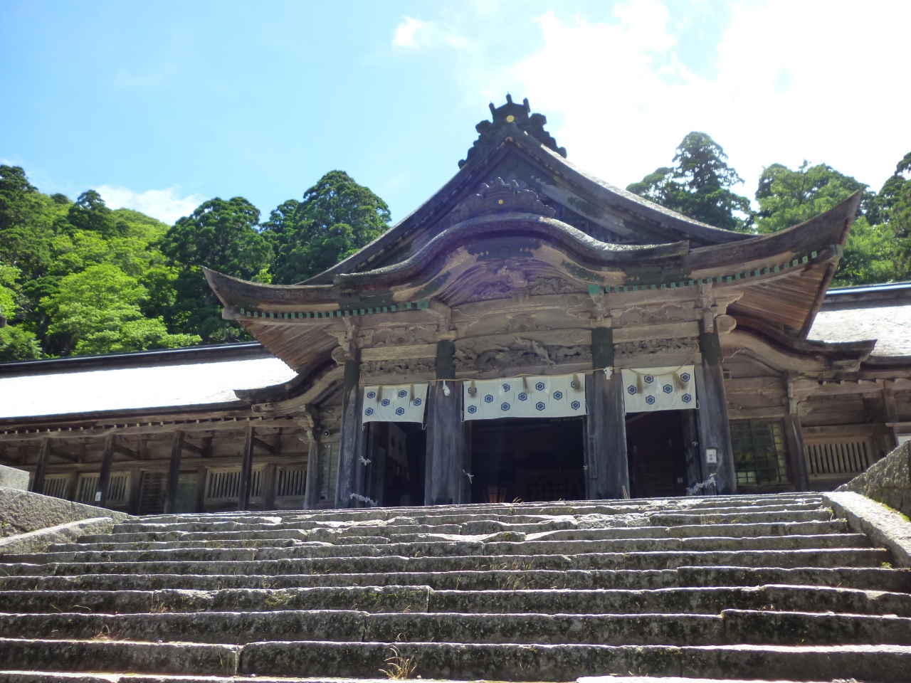 鳥居をくぐると長い長い石畳の参道が続きます。史跡や緑に元気づけられながら、頑張って上りました。後向き門をくぐるとご本殿があります。静かな空気に包まれた立派な社殿でお参りをするとすがすがしい気持ちになりました。