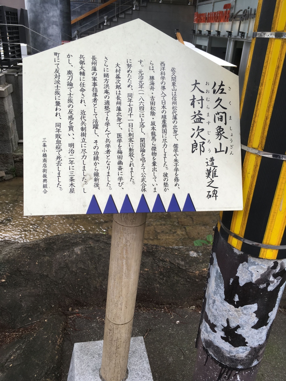 高瀬川沿いにある佐久間象山、大村益次郎遭難の碑。二人が亡くなったのは同じ日ではありませんが、ほぼ同じ場所で亡くなったのでこの碑が作られたとのこと。この碑の他はちょっとした説明書きしかないので、ある程度歴史の素養がないと正直意味を見出すのは難しいと感じました。