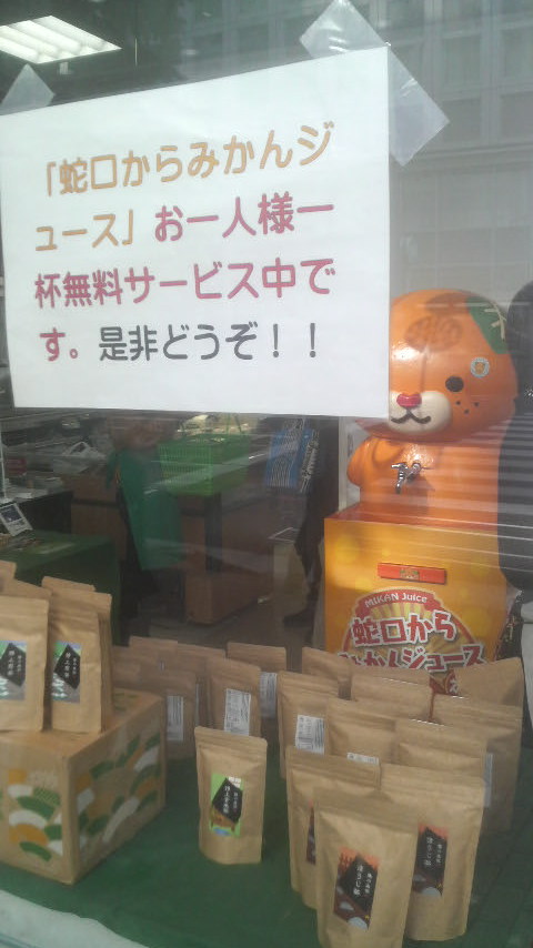 自宅用の菓子にとタルトなどを買いに行ったのですが、たまたまこの時は「蛇口からみかんジュース」の無料サービス中で、愛媛のゆるキャラ・みきゃんの人形に付けられた蛇口から出るみかんジュースを飲むことができ、愛媛みかんも堪能できてよかったです。