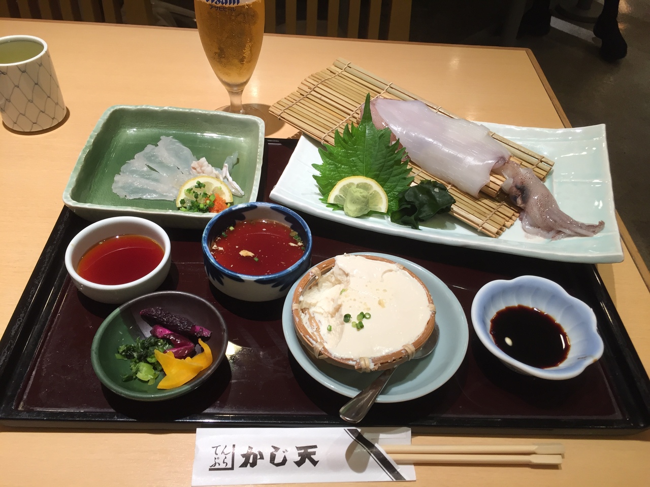 博多駅で晩酌、というシチュエーションで見つけました。一人でも入れる晩酌セットのあるお店を探していましたが、ここはもはや解析ミニコース。玄海のとらふぐ、イカを堪能できます!追加できる天ぷらも90円~と格安!絶対リピートします!