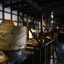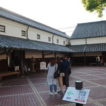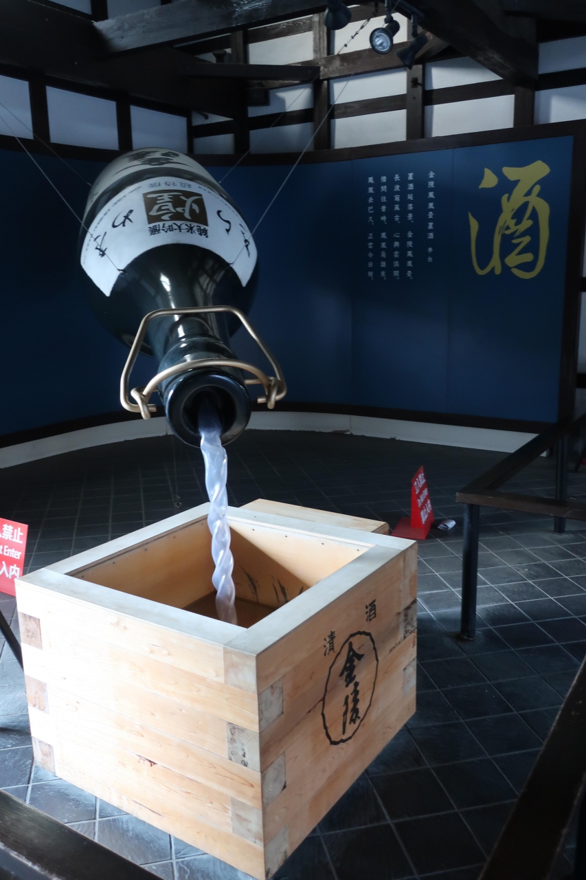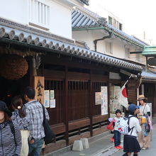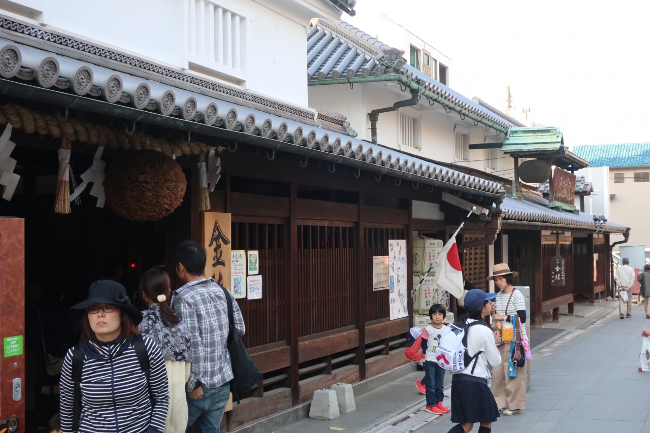 金刀比羅宮の表参道口の右手に創業300年の造り酒屋「金陵」の展示施設があります。これが金陵の郷です。正面は昔ながらの白壁に杉玉が掛かる酒蔵で中に入ると中庭には樹齢900年の大楠がとっても見事。建物内部では日本酒の製造工程や道具が展示され、しかも無料で見学できます。金刀比羅宮参拝の買えりにちょっとした休憩場所としても利用できるので、人気です。
