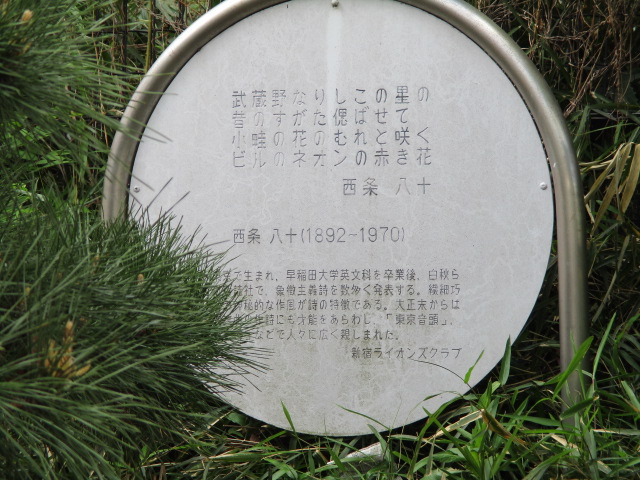 JR新宿駅東口から直ぐのスタジオアルタ前の広場にある西条八十 詩碑に歩いて1分ぐらいで着きます。西条八十(1892~1970)は詩人、作詞家で昭和の有名な歌謡曲を多く生み出しました。「愛染かつら」の主題歌や「同期の桜」「青い山脈」「東京音頭」「王将」など西條八十のつくった歌だとプレートを読んで昭和新宿繁華街で口遊んだのを懐かしく偲ばれます。植込みの花が綺麗に整備されてますがちょっと寂しさを感じさせられました。