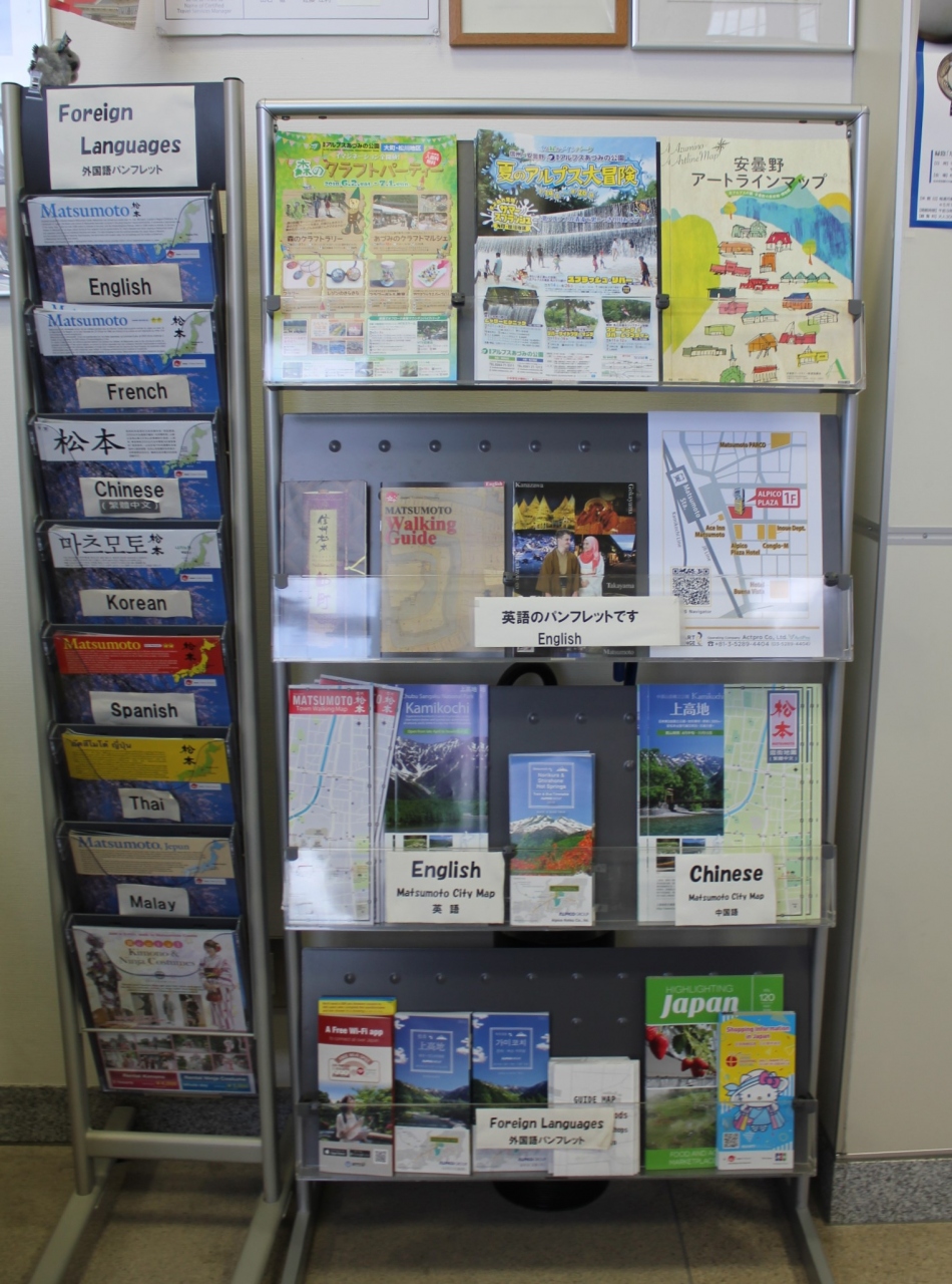 入口はあまり目立たず全体にこじんまりしていますが、パンフの種類は豊富でした。また外国人の姿も目立ちましたが、外国人向けのパンフも置いてあります。