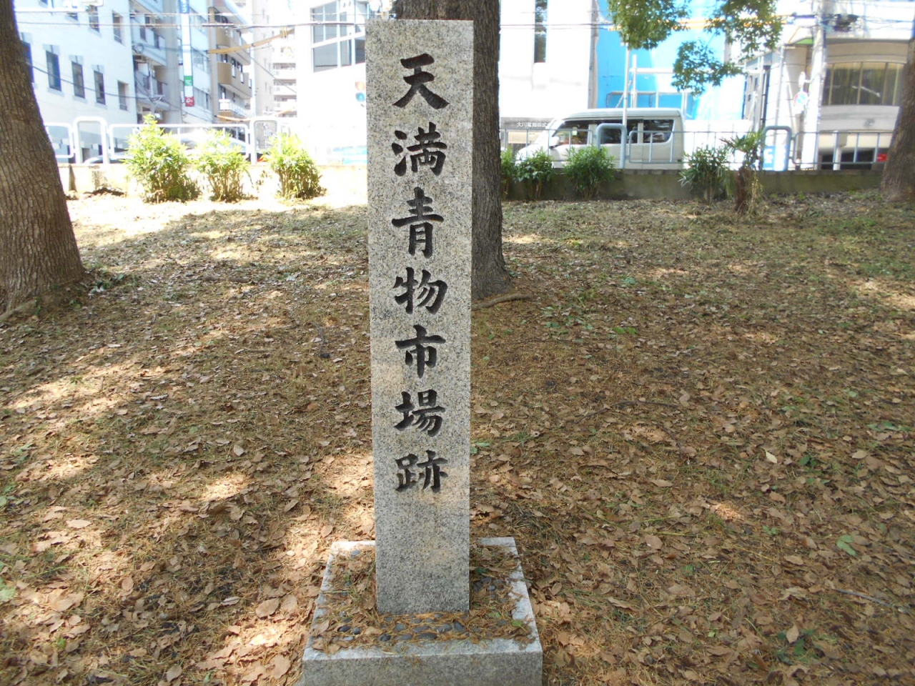 天満青物市場は江戸時代から昭和はじめまで、この地にありました。市内の相場を左右するほどの規模だったそうです。淀川の水運を利用して大阪近郊から新鮮な野菜が集められたそうです。大阪で唯一の青物市場でしたが、大阪中央卸売市場が設立され、吸収され廃止されたとのこと。