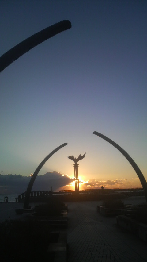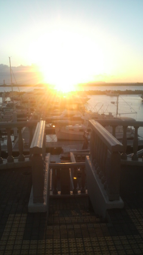 イタリアっぽいイメージで作られたらしいオブジェが並ぶテラスの先に朝日が登ってくる様子はなかなか見事で、周囲に並ぶヨットや水平線と合わせて絵になる写真を撮るのにもってこいでした。