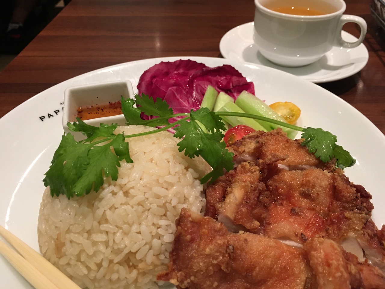 麺類も揃っており興味深かったが、タイで食べた屋台のカオマンガイを急に思い出し(その味と比べてはいけないことは百も承知で)カオマンガイトード(ようするにフライドチキンとチキンライス)にジャスミン茶を注文。