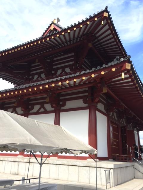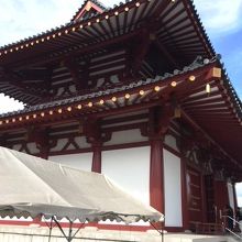 四天王寺の中心に建っています。西重門から入場料300円を支払って中央伽藍の中に入ると、右側に立派な五重塔があります。左側にはこの金堂がありました。本尊である救世観世音菩薩が安置されている四天王寺の本堂になります。建物の中に入ることもできました。法要をやっている最中でびっくりしました。