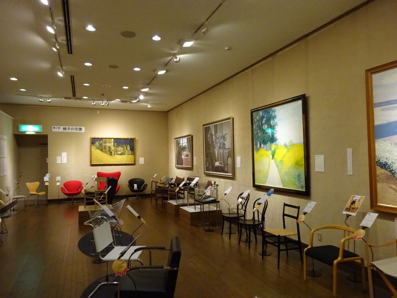 「家具と絵画のコラボレーション」と謳っている通り、前半の展示室には絵画に加えセンス溢れるデザインの椅子が並べられ、その一部は実際に座れるようになっています。