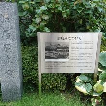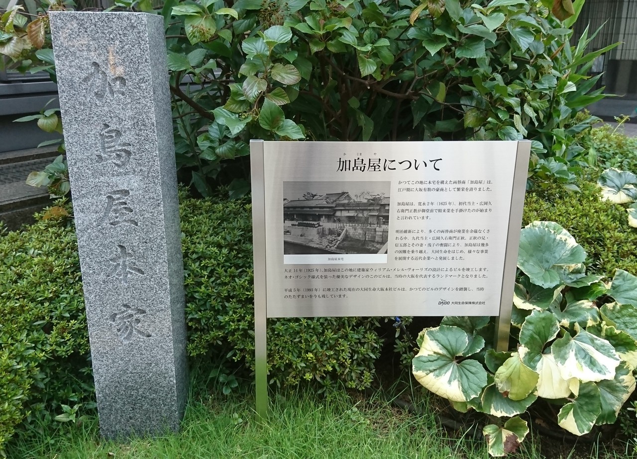 大阪肥後橋すぐの場所で、現在は大同生命大阪本社ビルがあります、その一角に加島家の碑が説明板とともにあります、江戸時代に両替商から始まり色々な事業をしていた豪商だそうでNHKの朝ドラ「あさが来た」の主人公の広岡浅子ゆかりの場所でもあります、大同生命大阪本社ビルの外観も独特で面白い建物です。