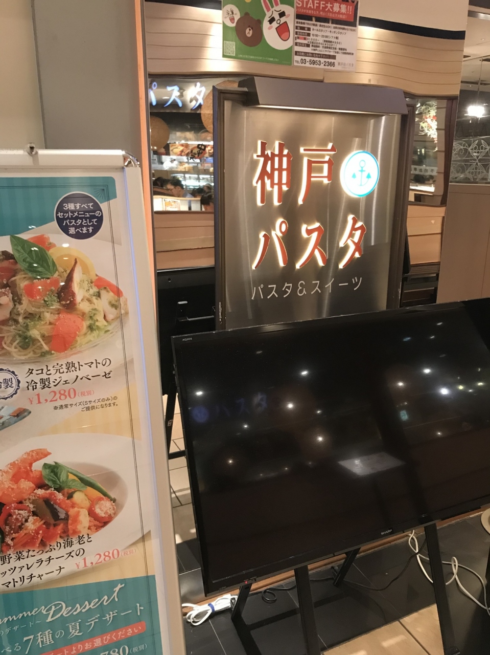 ヤマダ電気の9階にある、神戸パスタです。外は猛暑か続いているので、たこと完熟トマトのジェノベーゼの冷製パスタです、夏野菜の完熟トマトにたこはよく合う食材です。ジェノベーゼのコクがあるソースとよく絡みます。