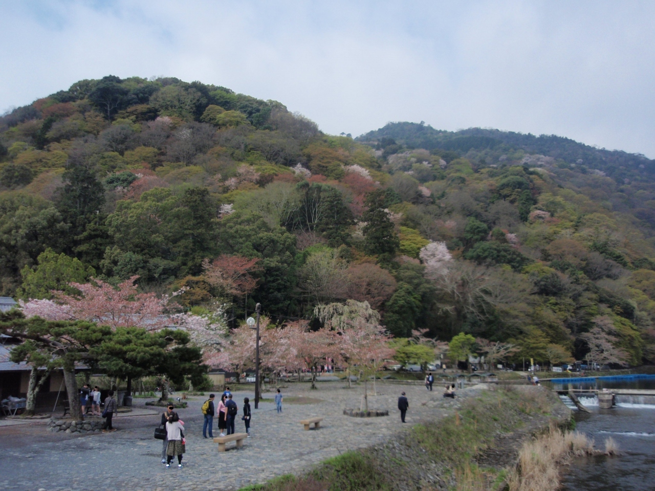 阪急嵐山駅より嵐山公園の中を通り、有名寺院の門前、清滝バス停を通り、右手の裏参道コースをとり、愛宕山三角点に登りました。阪急嵐山駅からすぐある太鼓橋を渡ってすぐある桂川の中洲にある公園です(ここから渡月橋を渡り、北西に行くと嵐山公園(亀山地区)があり、対岸には臨川寺地区があります)。北西に渡月橋がかかり絶景の写真スポットです。飲食店や土産物屋が並んでおり、グルメやショッピングが楽しめます。ソメイヨシノは最盛期を過ぎていましたが、まだ見られる木も残っており満開のシダレサクラと合わせて桜を楽しむことができました
