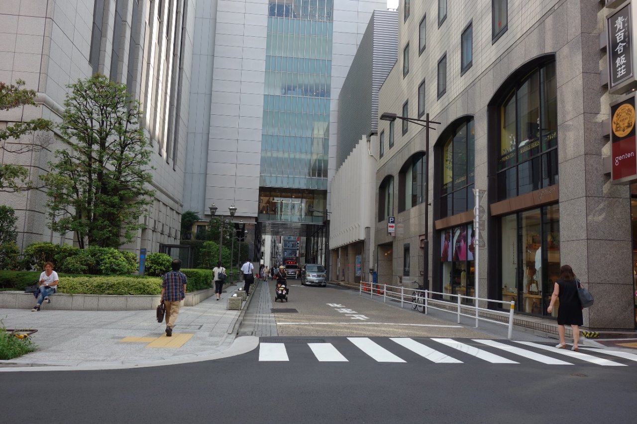 銀座中央通り沿いに有る松屋や三越のデパート裏を通る道路です。道幅は広くありませんが、このあたりに各デパートやショッピングセンターの駐車場がいくつか有って、特に休日は駐車場へ誘導するプラカードを持った係の方たちが忙しそうにしている姿を見ます。