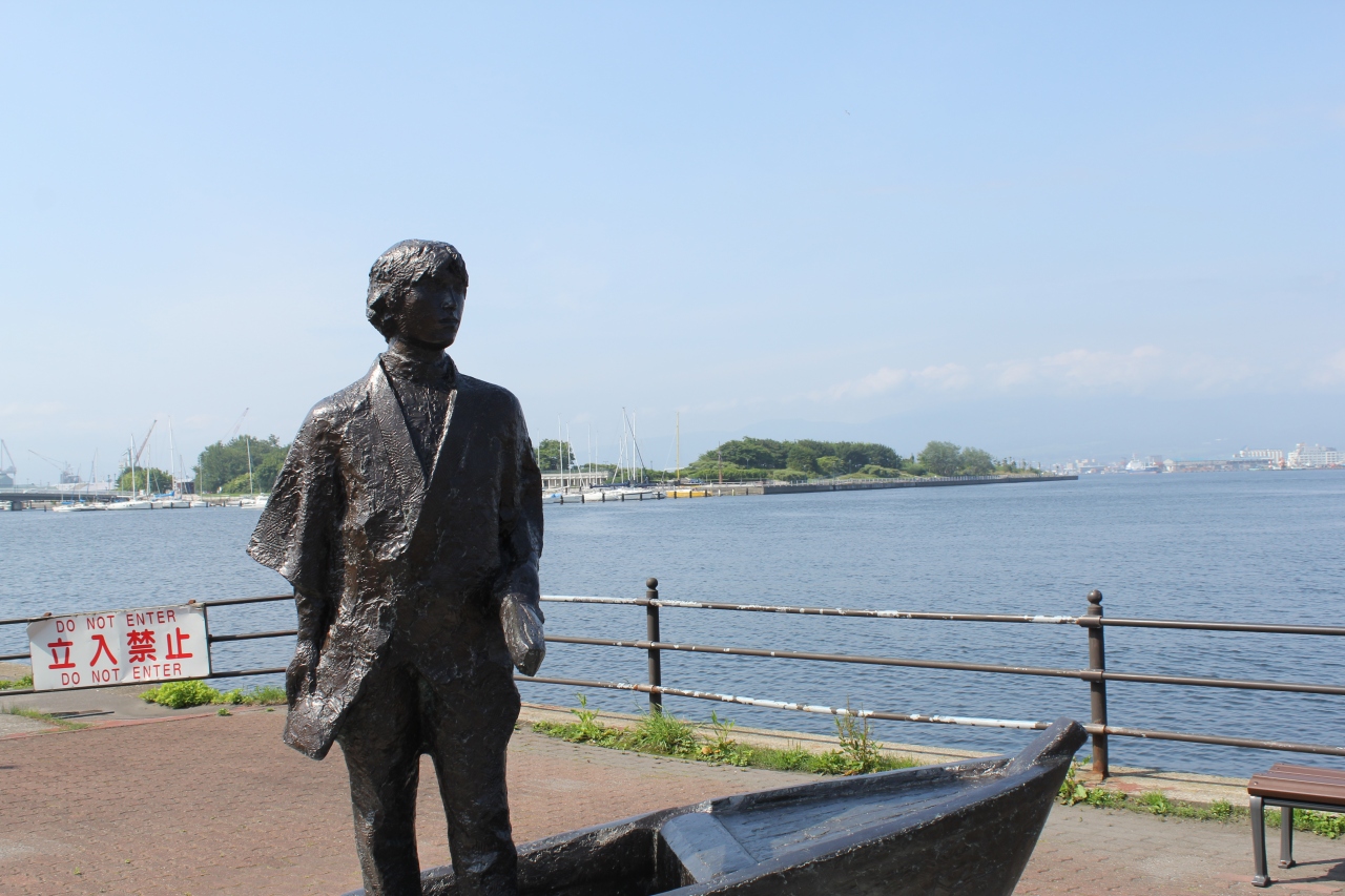 七月の三連休、北海道新幹線に乗って函館へ旅行にいきました。函館駅から海沿いの道をはこだてドックへ向かい歩いていると新島襄のブロンズ像がありました。このブロンズ像の正式名称は「記念撮影 未来への始まり・海原」だそうです。函館から密出国するために船に乗り込む姿を再現しているそうです。