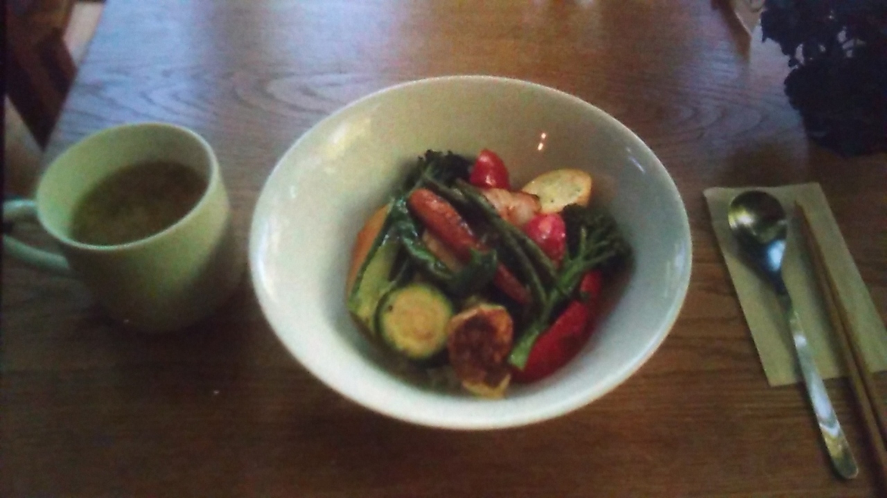 ごはんの上にローストした野菜がたくさんのっています