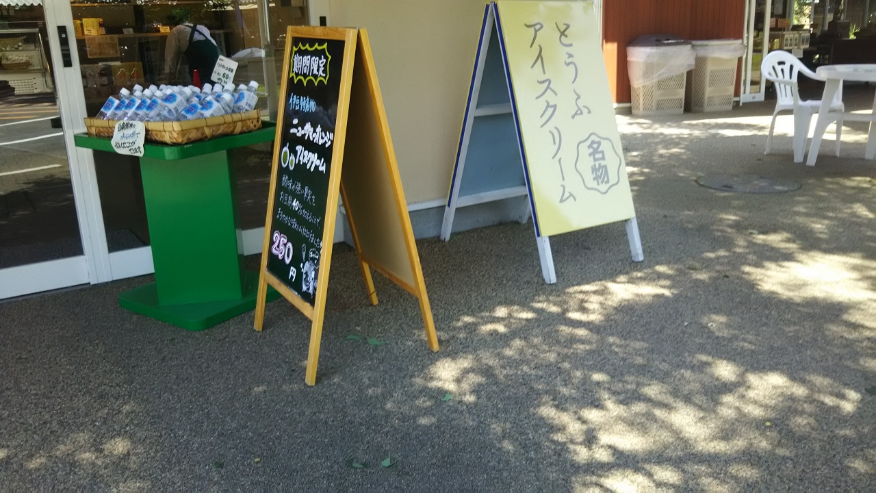 柿田川涌水群の駐車場へ車を止めると、すぐ近くにお店が見えます。おしゃれな雰囲気で、豆腐のお店のようですが、前の看板に「とうふアイスクリーム名物」と書かれていました。どんな味なのか気になったので、一つ購入。お店の前にも椅子とテーブルがあったのですが、裏に回ったあたりに木陰の椅子と休憩所もありました。目の前に涌水が湧きだすのを見ながら食べるアイスは、とても涼しげでした。