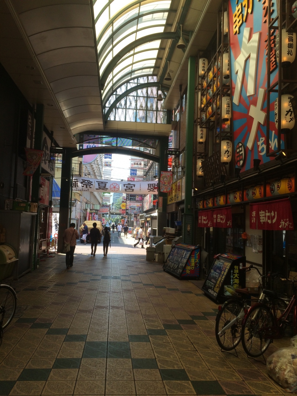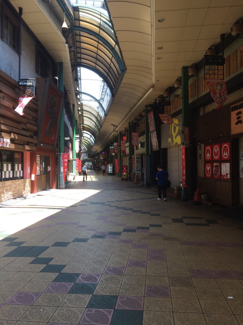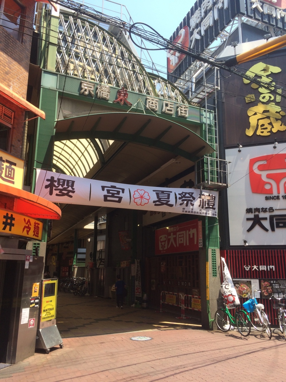 京阪・JRの京橋駅から徒歩1分ほどでは駅には近い方が焼肉屋や串カツ屋等があり賑やかで、遠くに行くと店側減って日曜日に行ったのにシャッター閉まっている店がいくつかありました。駅から歩くと途中道が広くなる場所があります。