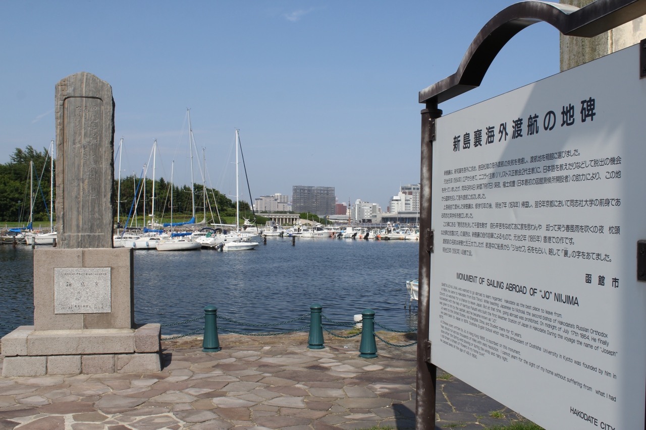 新島襄のブロンズ像があり、もう少し歩くと新島襄海外渡航の地碑がありました。緑の島の手前です。アメリカに秘航した際の記念碑だそうです。