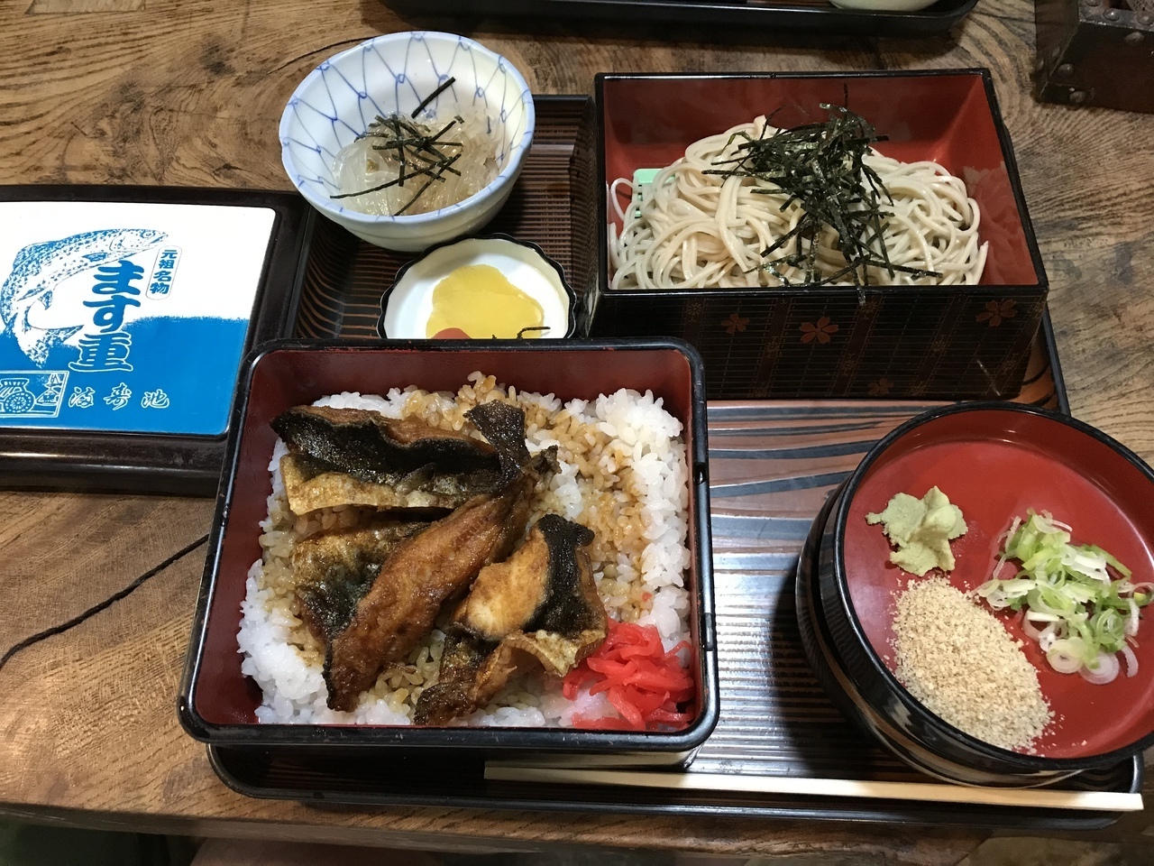 目指すます重を定食で半そば付きで頼むと、専用の器で提供されました。揚げたますに甘辛ダレが香ばしく、倉渕産のお米がまた美味しい一品です。