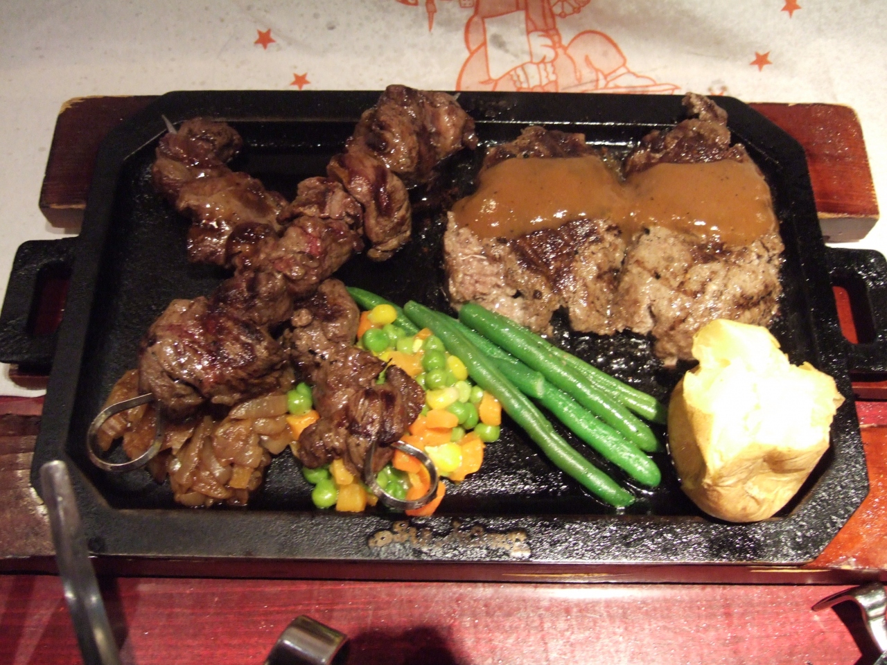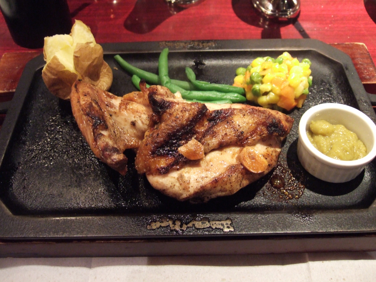 ハンバーグと牛串のコンボに、BBQチキンをオーダー。ハンバーグは熱々の鉄板で供され、目の前で切ってソースをかけて仕上げてくれます。玉ねぎもパン粉も使わないハンバーグで、肉をかみしめたい時には最適です。ハンバーグ、牛串、BBQチキンと3種類のソースが出ましたが、BBQチキンのソースが一番でした。