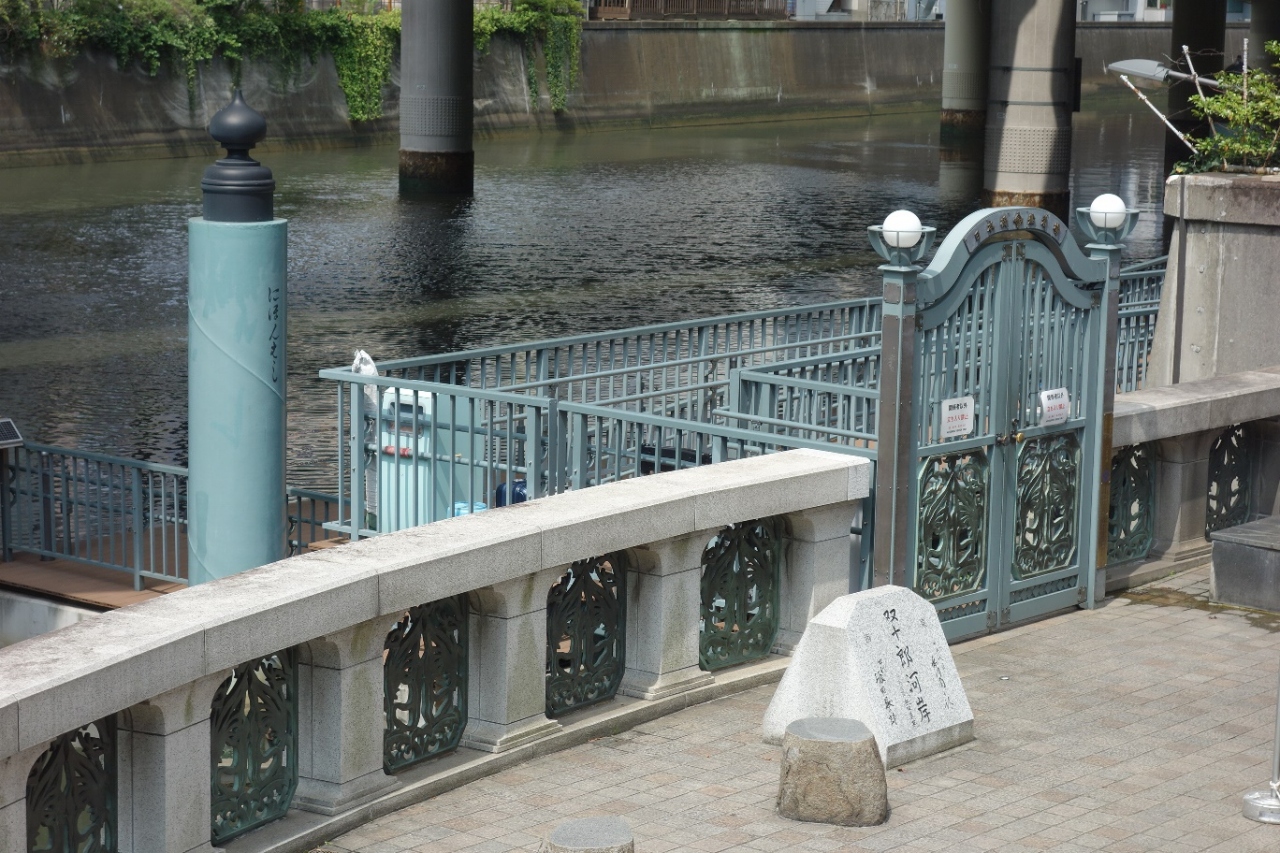 日本の交通の中心であり観光地でもある日本橋ですが、橋の周囲には色々な記念碑が置かれています。この双十郎河岸の碑もその一つで、橋の近くの滝の広場に置かれていました。双十郎の由来は市川團十郎と坂田藤十郎の2人の歌舞伎役者の名前にあるそうです。
