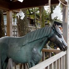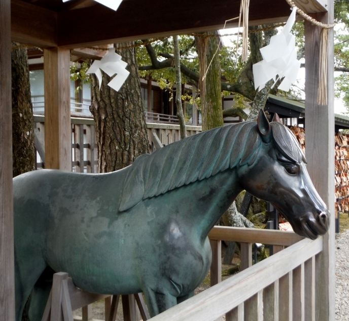 出雲大社の神域の入口にある銅の鳥居をくぐってすぐ左手にある銅像です。神様の乗り物とされる動物です。鼻のあたりを触るとご利益があるとか。神馬は子宝と安産、神牛は学問だぞうです。どちらの像もつぶらな多いな瞳でなんとなく愛らし感じがします。