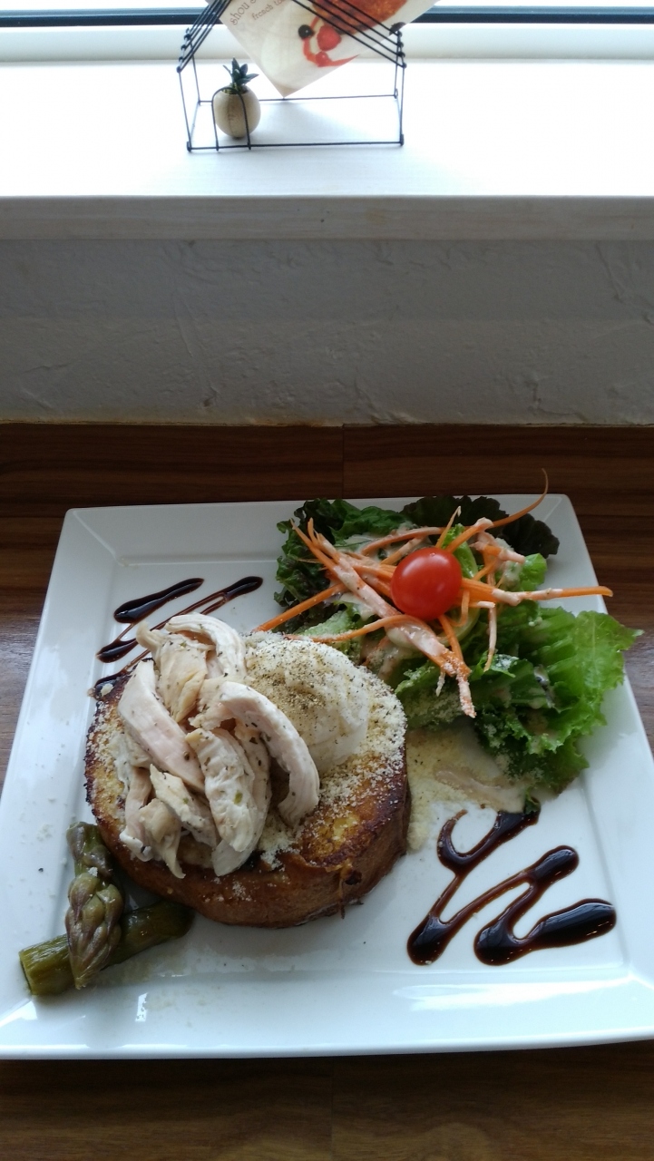 今回はチキンサラダのフレンチトーストを注文。店主の女性が、注文を受けてから丁寧に調理するため10分ほどかかりますが、料理は素晴らしいものでした。