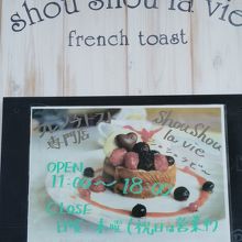 千歳市内にある、フレンチトースト専門店。デザート系から軽食タイプまで、数種類のフレンチトーストがいただけます。追加料金でドリンクもセット可能で、時期によってオリジナルジュースも飲めます。
