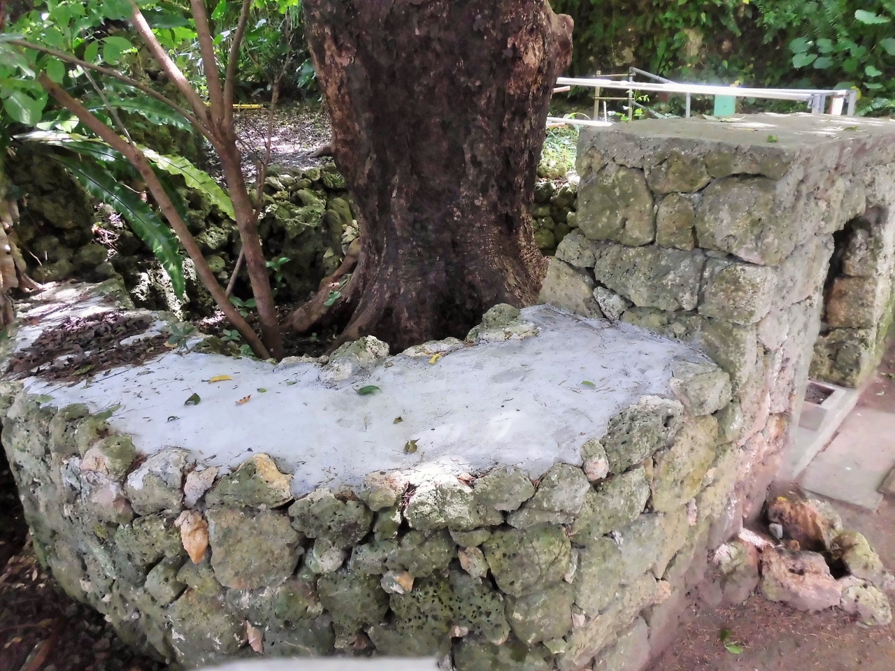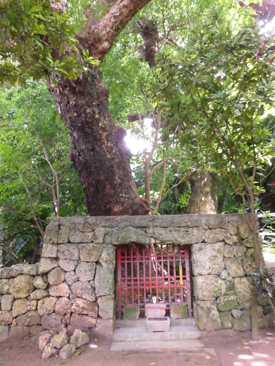 首里金城の大アカギのすぐ近くにあります。3m四方を丸く石垣で囲い、正面にはマグサ石をかけた石門の形になっており、大アカギの下に三個の石が立てるという沖縄独特の御嶽の形式です。この独特な御嶽は、かなり昔からあるそうです。今流に言えば、パワースポットなのでしょうね。歴史を感じます。