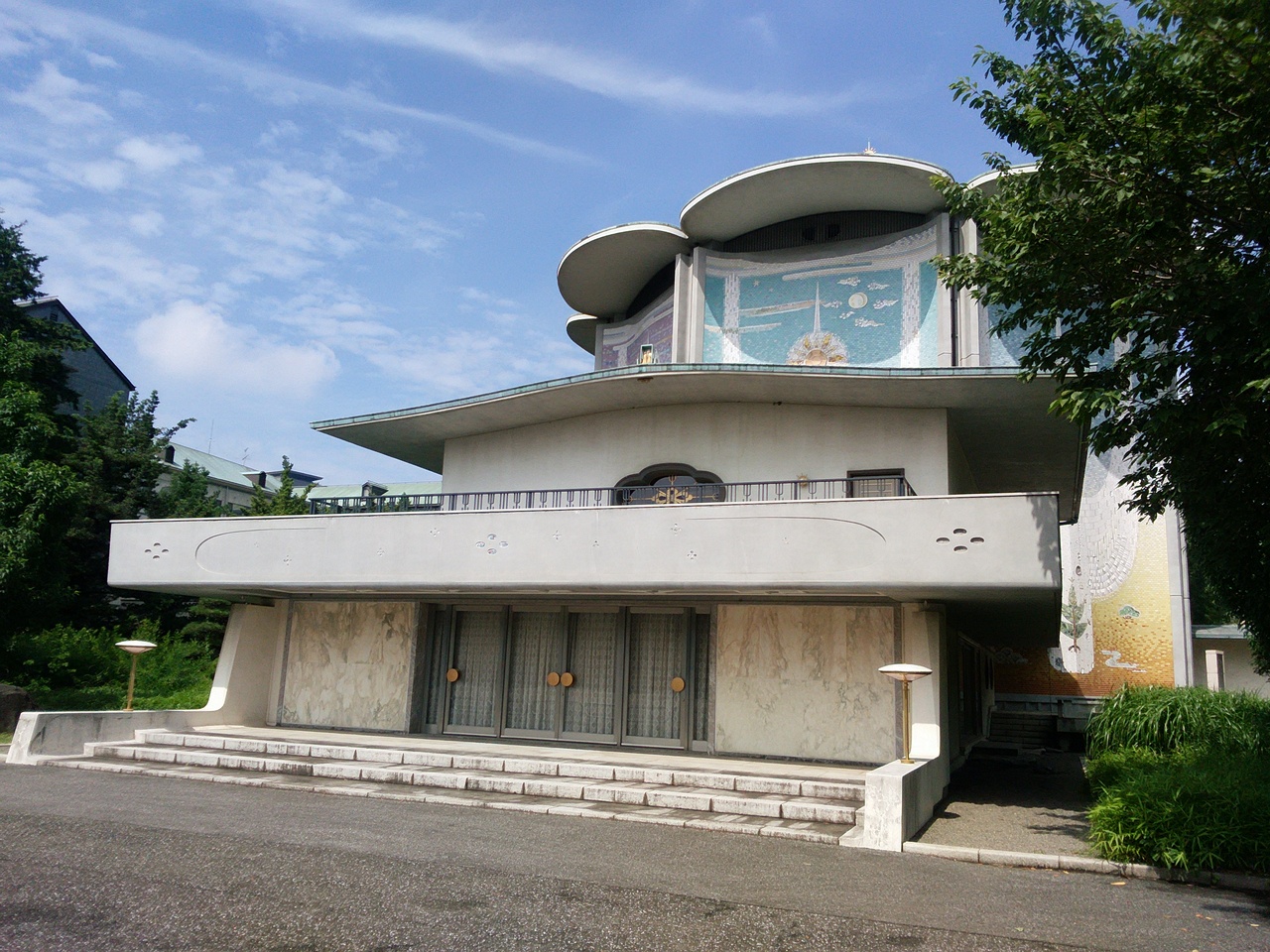 本丸跡や天守台のすぐ近くにあるユニークなデザインの建物が桃華楽堂です。香淳皇后の還暦記念として建設されたです。鉄仙の花弁を形どった屋根と八面体の外壁の各面に大きく羽ばたく鳥が抽象的に描かれた建物は特徴的で見ごたえがありました。