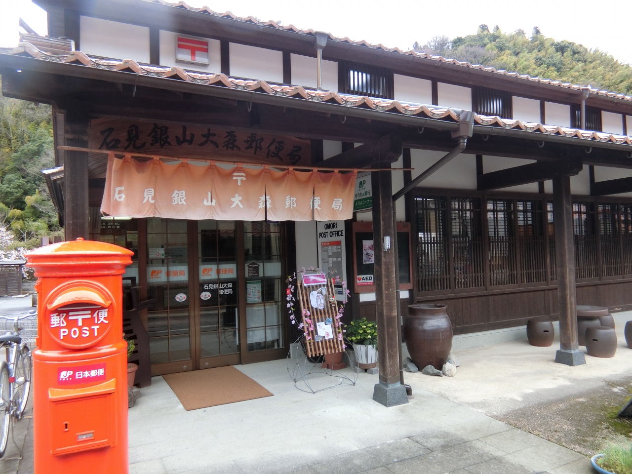 大森地区を散策していると赤いポストが見えてきました。郵便局です。古い街並みに合わせるように木造建築で、石見銀山大森郵便局と暖簾がぶら下がっています。この赤いポストも今では見かけなくなり、懐かしくなってきます。町に合ういい雰囲気の郵便局です。
