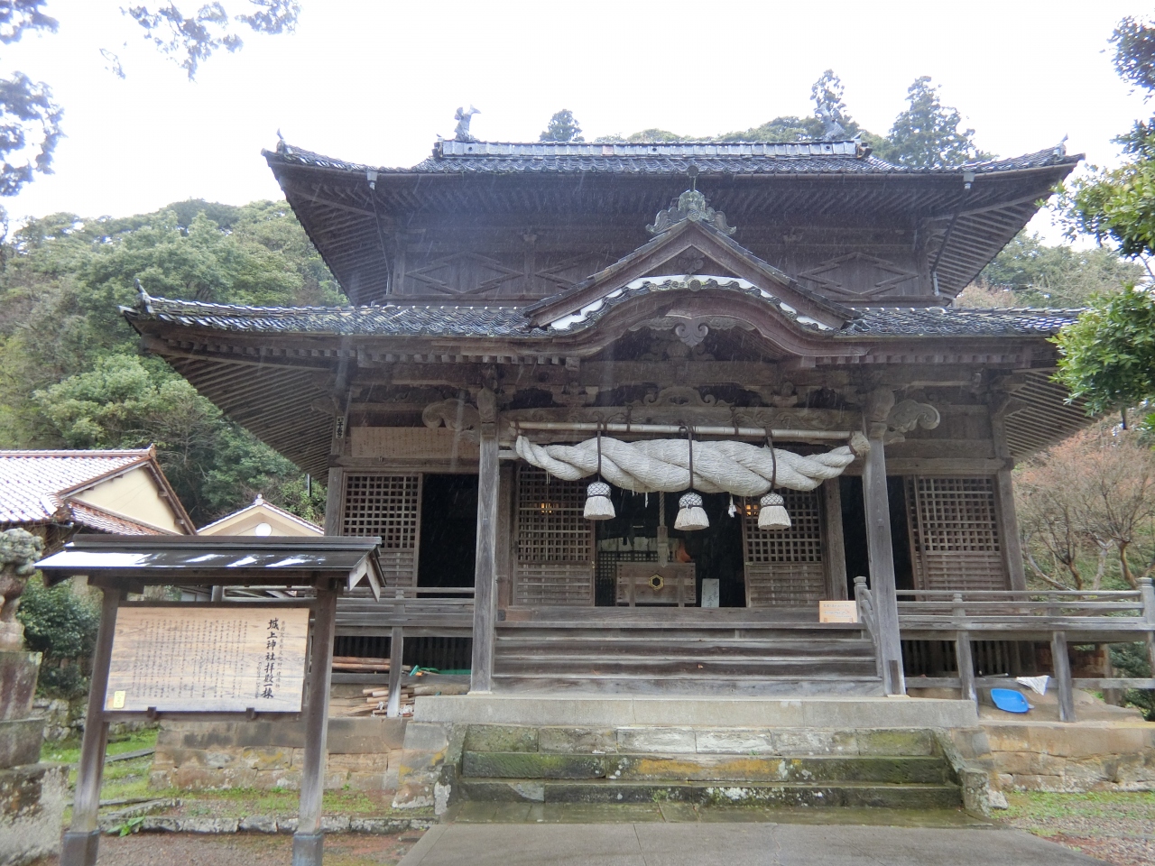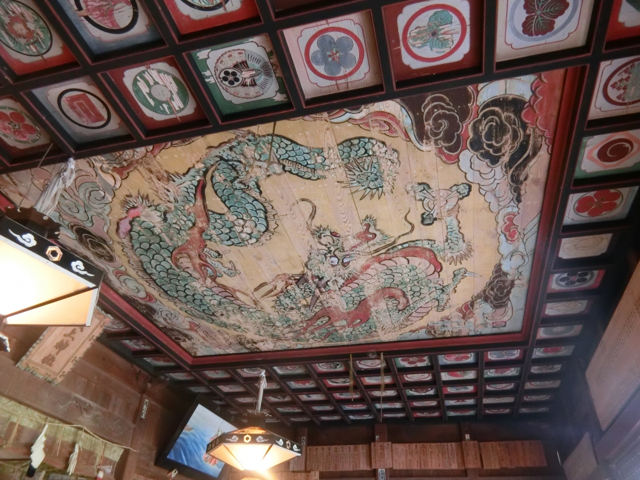 龍源寺間歩に来て初めに行ったのが、城上神社です。出発点に近く、代官所跡の奥にあり少し階段を上っていきます。古い神社でひっそりとしていて誰もいませんでした。中に入ると天井の絵が見事。ここに描かれているのは立派な龍の絵。この下で手をたたくとリンリンという鳴き声が聞こえるというが、よくわからなかった。