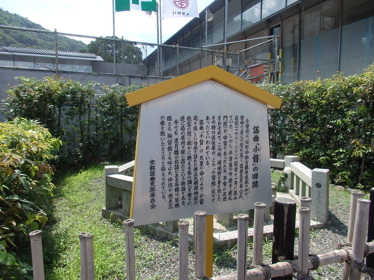 何十回も京都を訪れていますが、今回初めて小督塚に行きました。保津川の左岸を少し上流側に行き、1つ目の道を右折してすぐ左側にあります。小督は高倉天皇の寵愛を一身に受けていた後宮です。高倉天皇の中宮建礼門院の父平清盛がこれを良しとせず、宮中を追い出してしまう。小督は清盛をおそれて、ここ嵯峨野に身を隠し、その時の住居がこの小督塚あたりであったといわれています。平家物語や能「小督」に取り上げられている悲恋のヒロインです。石碑が建っているのみで、説明版がないと通り過ぎてしまうような小さな施設です。平家物語ファンにはお勧めです