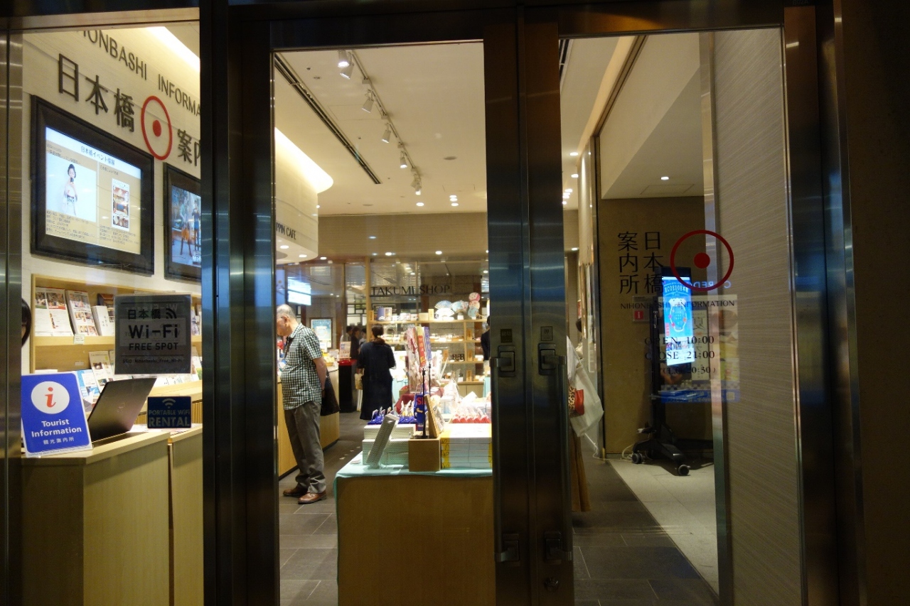 日本橋に有るコレド室町の地下一階に案内所が有りました。ガラス張りで入りやすい雰囲気で中に入ると大きな地図が有ったり各種パンフレットやお土産品など置いてありました。カフェらしき席も用意されていたしスタッフさんは多言語対応だそうで能力の高さも感じました。