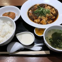 メインの麻婆豆腐、小鉢、ご飯、スープ、漬物のセットになっています。
