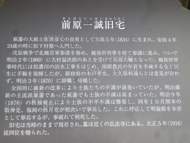 今回は「維新のふるさと」とも言われている憧れの城下町を散策する旅行です。萩は明治維新に至るまでの約260年に渡って防長二州(周防、長門)を中心として栄えていました。前原一誠は維新の十傑の一人でしたが、のちに明治政府に対する反逆の萩の乱の首謀者となり死罪となってしまったそうです。そんな前原旧宅門前には石柱と案内板があって中に入ることはできませんがここ松本川沿いには他に小川家長屋門や井上勝旧宅が当時のままと残されています。当時の面影を楽しめる散策路でもあります。是非お立ち寄りくださいね。