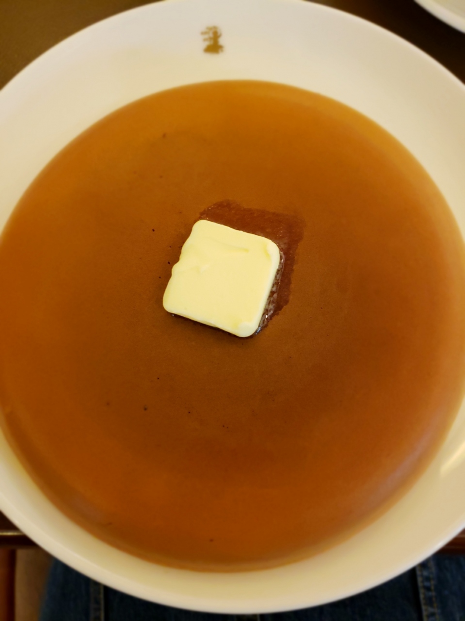 綺麗な黄金色のパンケーキ。以前よりサイズが小さくなったとのことでしたが、これでも十分な大きさ満足感です。バターのコクをしっかりと感じられる、昔ながらのホットケーキのようなふかふかのパンケーキ。とても美味しくいただきました。バターとシロップのみ、素材の味を楽しめますね。飲み放題の紅茶で楽しい時間を満喫できました。