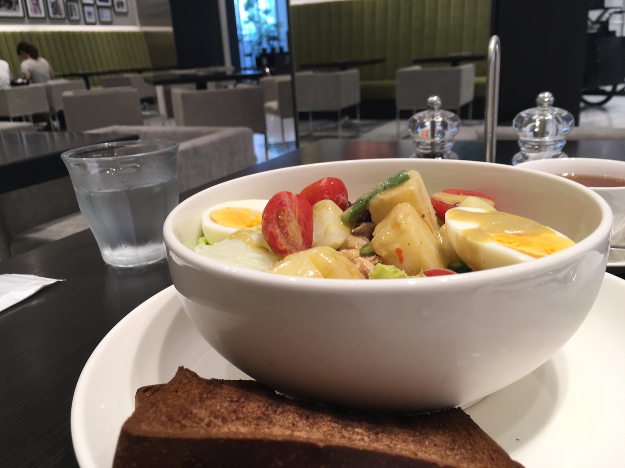 それなりのお金を払うだけあって、かなりボリュームのあるサラダが登場。当初の「軽めのランチ」という方向からは若干のズレが生じているようにも思うが、いかにじゃがいもとゆで卵の迫力があろうと所詮サラダなのでお腹に持たれないという意味では予定通り。