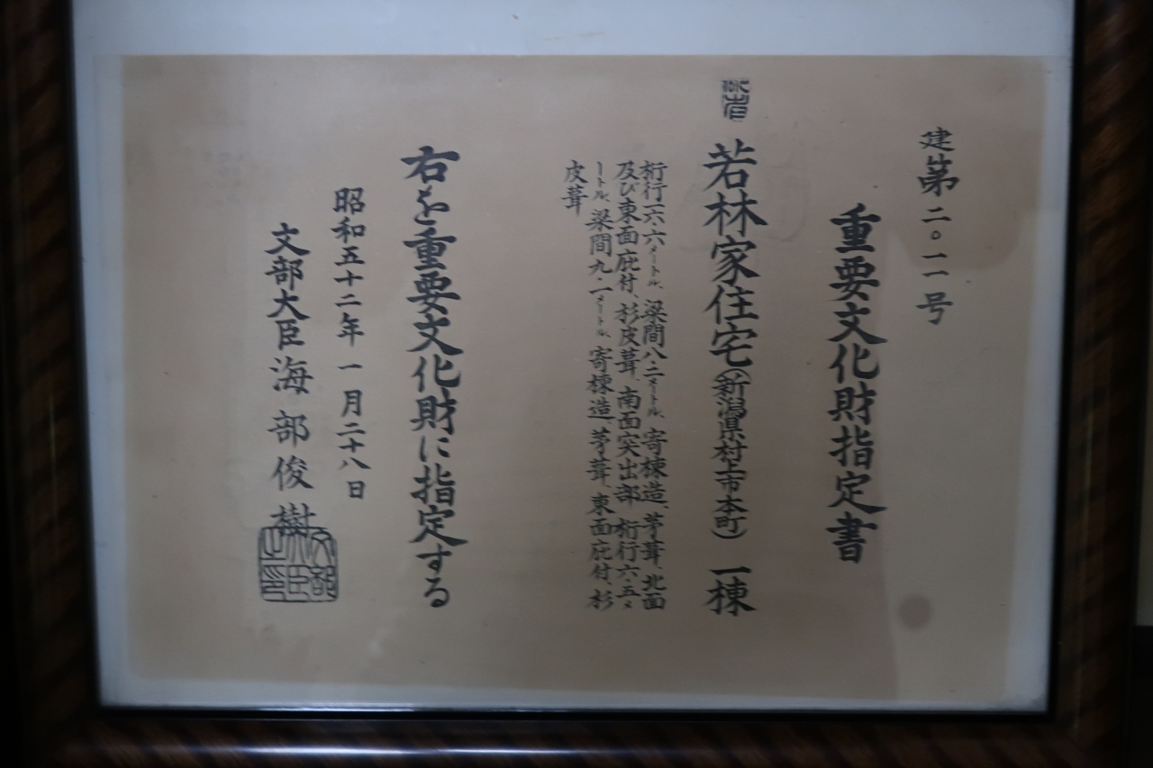 村上小学校の東側、村上市郷土資料館の隣に若林家住宅があります。1800年頃に建てられたL字型をした茅葺寄棟造りの曲家で、村上藩時代の中級武士の屋敷だった建物です。外観は茅葺屋根に苔が生え、敷台や、囲炉裏、水屋などがあり、時代を物語っていますが、中は修理されており今でも生活できそうな感じがしました。