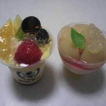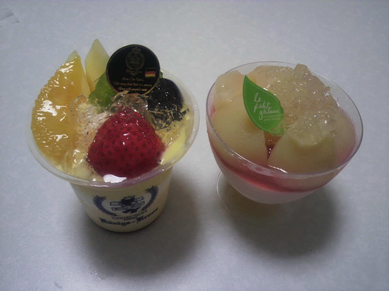 今回は、いちご、キウイ、ブドウ、オレンジと白玉がが入ったパフェと桃がたっぷり入ったパフェの2種類を購入!