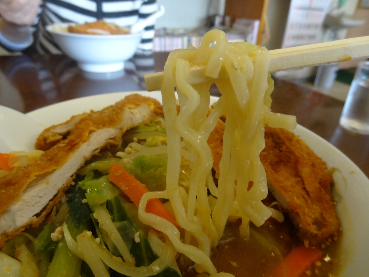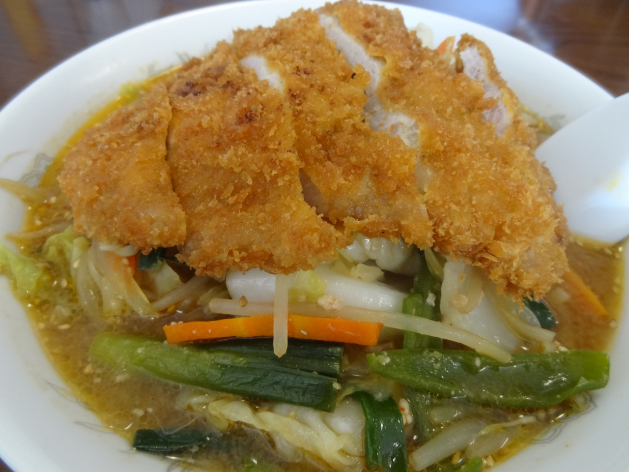 この店はお肉屋さんも経営しています。駐車場は西側の歩道に面したスペースに5台ほど停められます。大衆食堂のお店で、地元の人で常ににぎわっています。人気メニューはとんかつラーメン(850円)。オーダーしたのは50円増しのとんかつみそラーメン。待つこと、7分ほど。テーブルに出されたラーメンのボリュームにビックリ!丼いっぱいに盛られた麺の上にさらに大きなトンカツがのっかっています。女性には少し量が多めかなという感じ。トンカツと麺の間にはこれまた野菜の具がたっぷり。多めの麺に加えてトンカツまで食べられるとは大食いの域に達しています。お腹一杯になるまで食べてみたいなら、このお店はバッチリ!