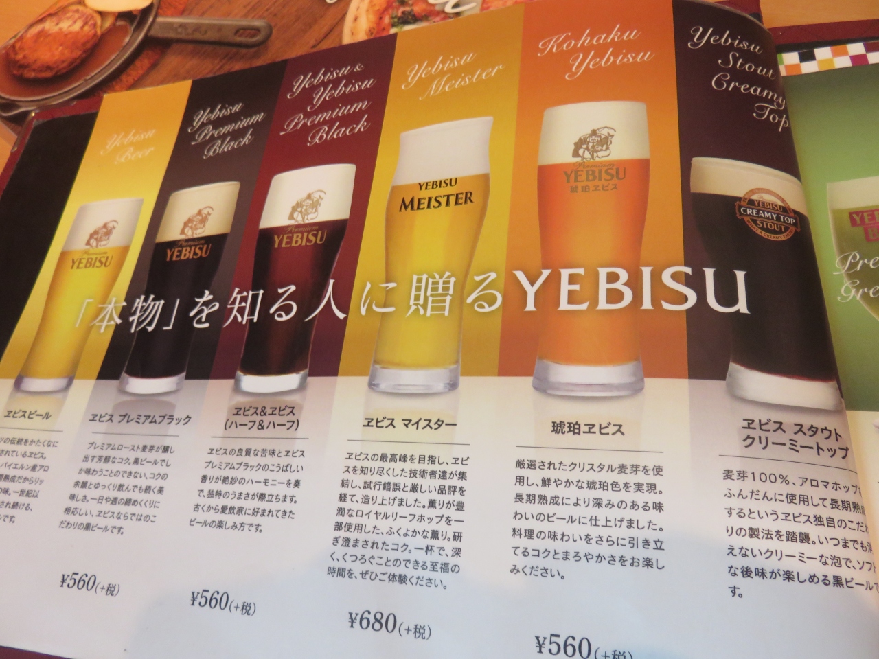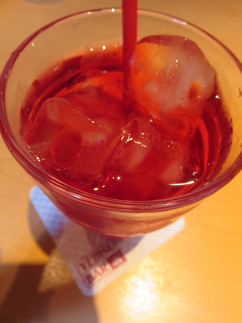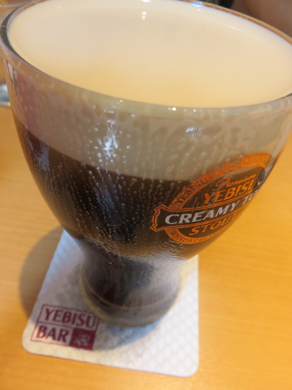 エビスといえば黒ビールらしく、暑い京都の夏に、エビススタウトクリーミートップを主人は2杯、私はクランベリードリンクをいただきました