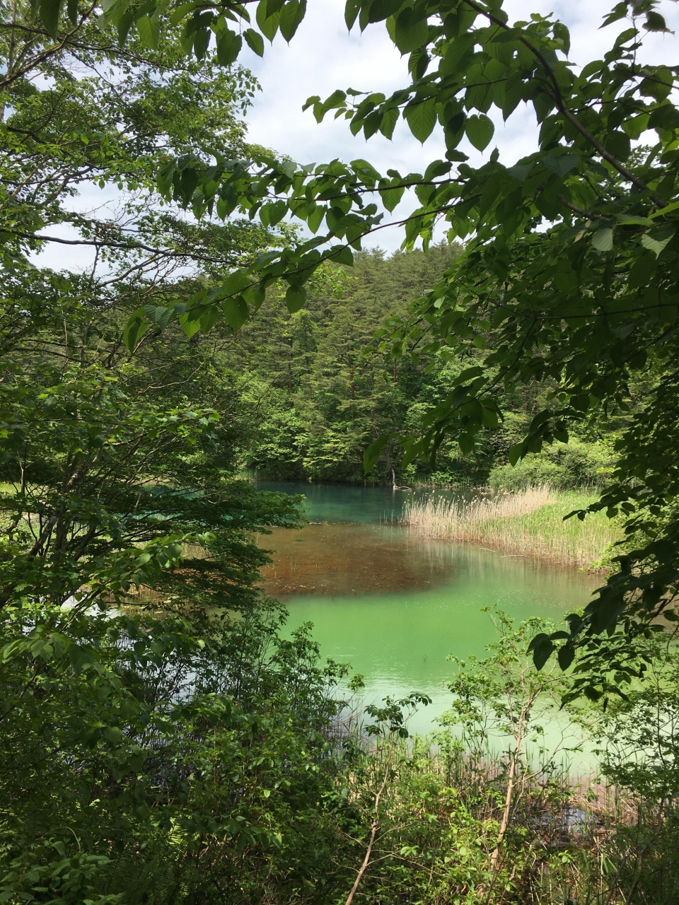 五色沼の探索路を毘沙門沼からスタートして、次に出てくるのが赤沼です。大きさはそこまで大きくなく、鉄分が入っているため赤く見えるということでしたが、根の色が赤色の植物が植わっており、それだから赤沼と名前がついているのだと思っていました。赤く色づいたところも見てみたいと思いました。