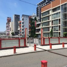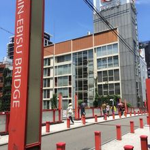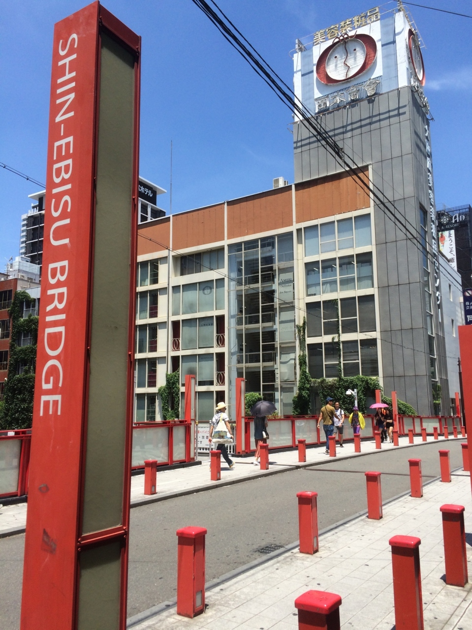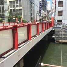 橋の脇には出世地蔵がひっそりと立っていました。道頓堀橋と大黒橋の間にある橋で、1車線の車道と左右の歩道の間には赤い杭がいくつか並んでいました。橋の名前も英語で書いてあり、おしゃれな橋で、橋の高さは低いです。