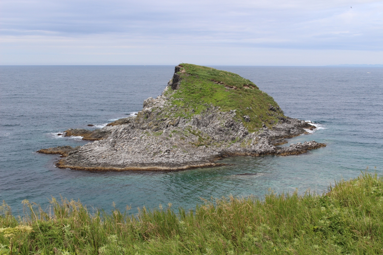 高台の展望台に登ると、眼前にウミネコが飛び交うポンモシリ島を、視線を右に移すとペシ岬を、背後を振り返ると、草原の向こうにどっしりと利尻山を望む。