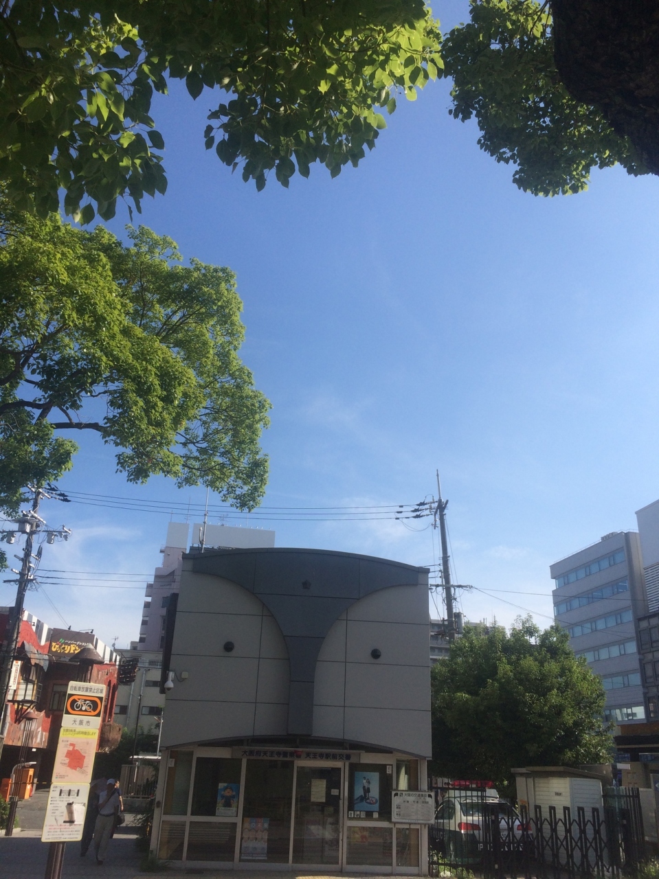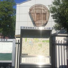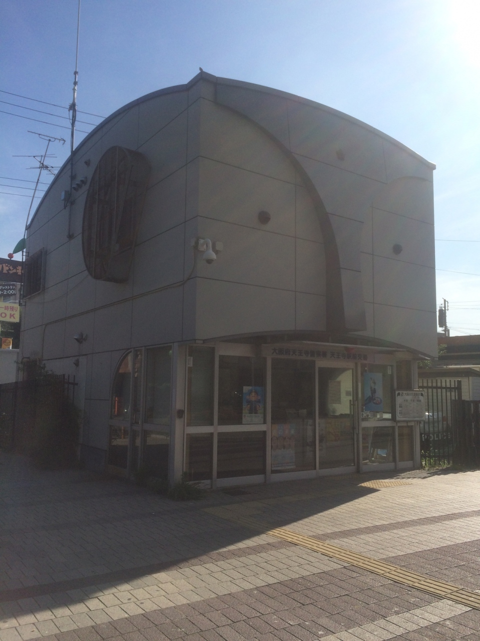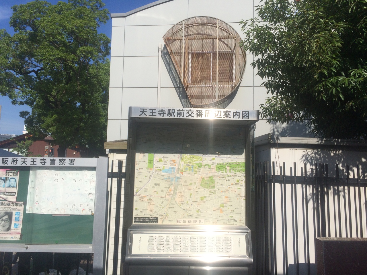 天王寺公園の入口付近にありましたがメインの出入口の横の道にあるので見逃してしまう人が多い建物かも知れません。建物の正面は英語のTを逆さにしたような装飾があり、少しお洒落感を出した建物でした。パトカーが1台停まっていて、横には天王寺周辺の地図があるので便利です。