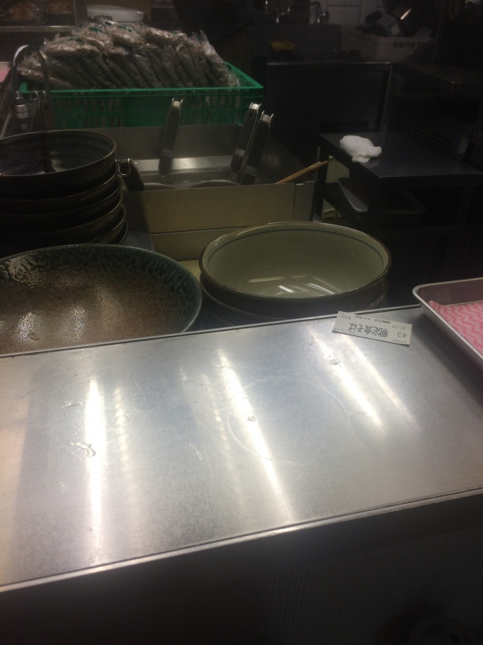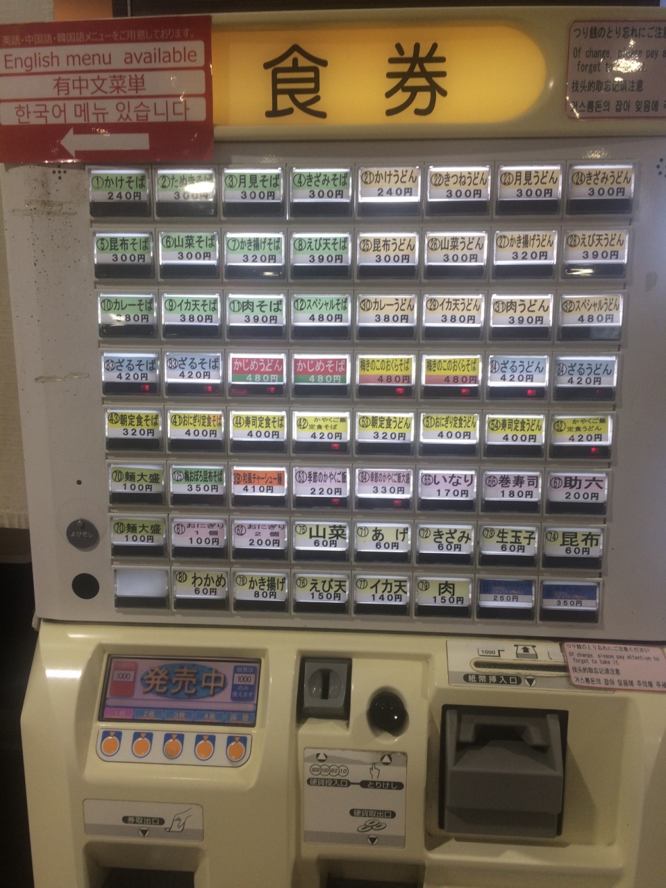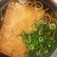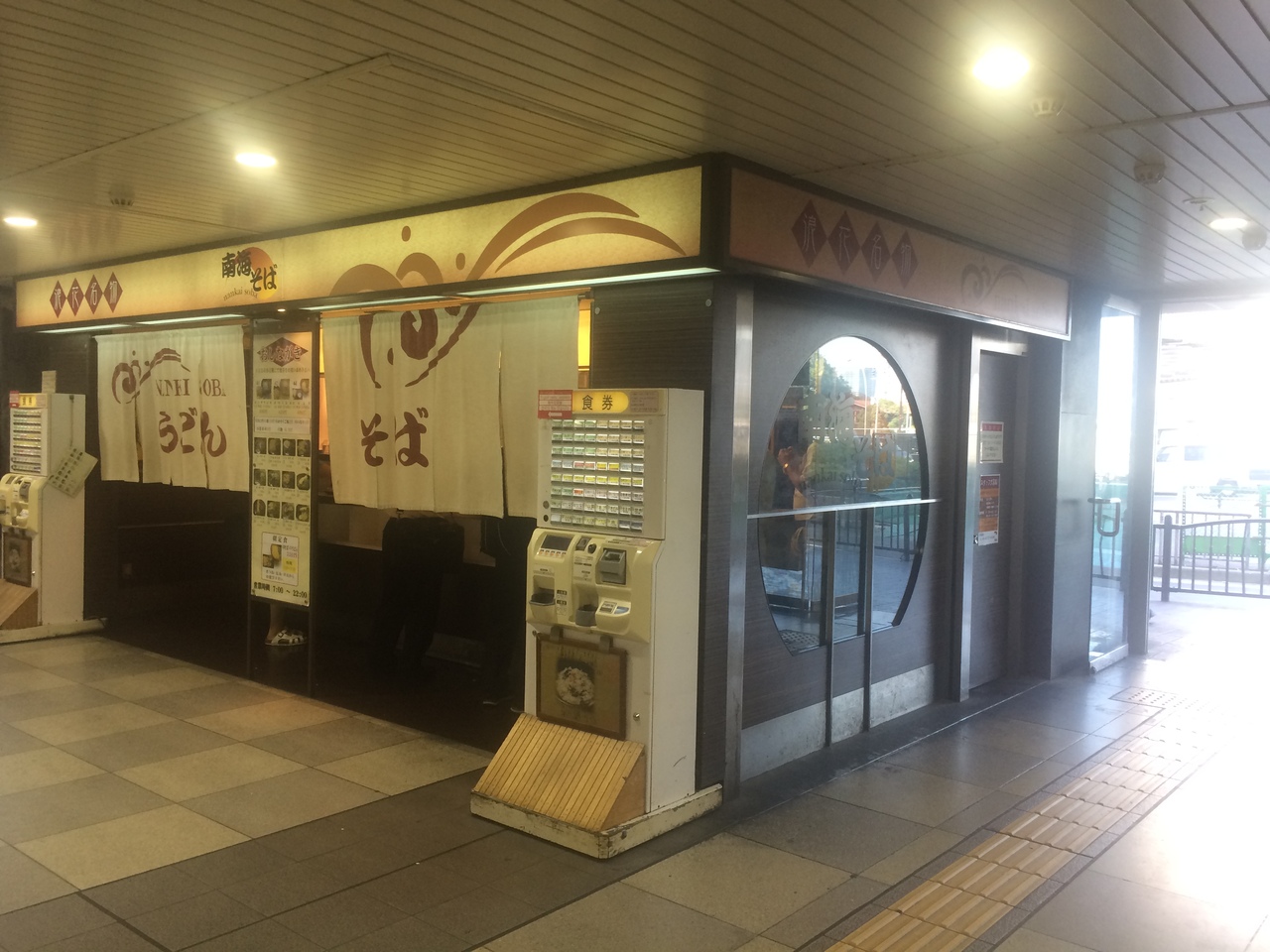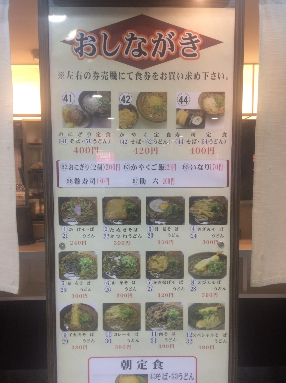 店の左右にある自動販売機で、どのメニューにしようか迷っていたら店の真ん中に、おしながき と書いてありお得なセットメニューがあったので、そばとおにぎり2個付きの朝定食を購入。そばは、きつね、昆布、月見から一つ選びます。さっぱりとした麺とつゆでおにぎりも美味く得した気分になりました。そばは一つづつ袋には入っているのを茹でていました。立ち食い専門店です。
