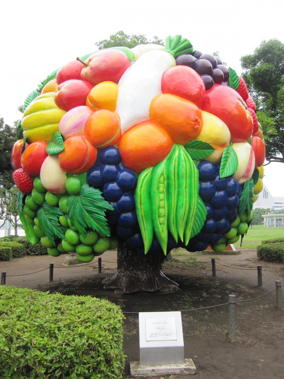臨港パーク内にありカラフルで大きなオブジェで目立っていました。フルーツツリーと言いながらダイコンなどの野菜もフルーツに混じっています。